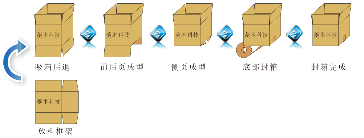 纸箱封底:通过夹紧皮带的旋转前进完成纸箱底部的胶带封贴工作。