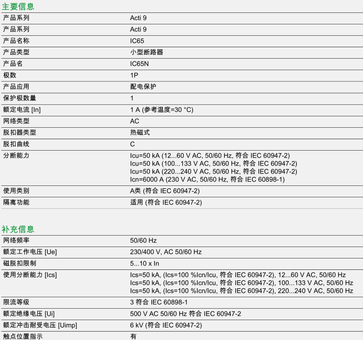 iC65N 小型断路器, B曲线, 1P, 1A