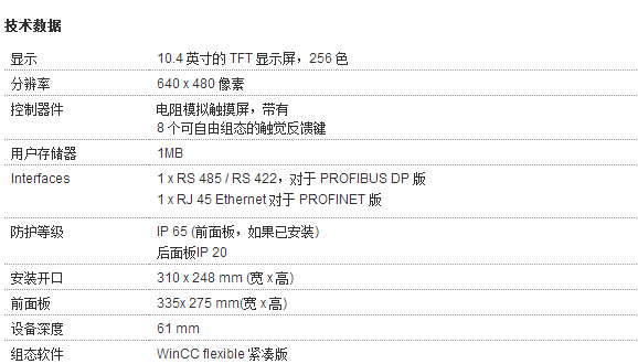 适用于中等性能范围的任务的 HMI,根据所选的版本可用于 PROFIBUS 或 PROFINET 网络;