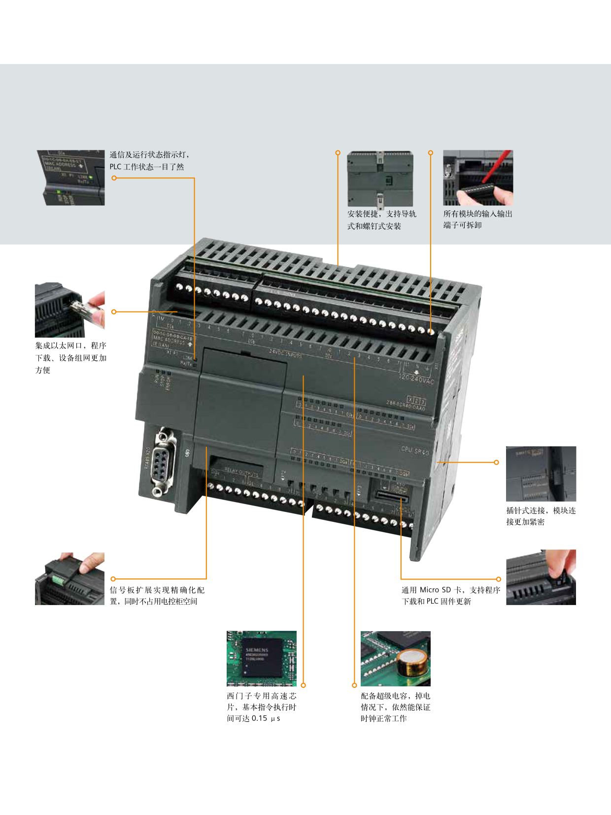 配备西门子专用处理器芯片,基本指令执行时间可达0.15 μ s,在同级别小型PLC中遥遥领先。一颗有力的“芯”,能让您在应对繁琐的程序逻辑,复杂的工艺要求时表现的从容不迫。