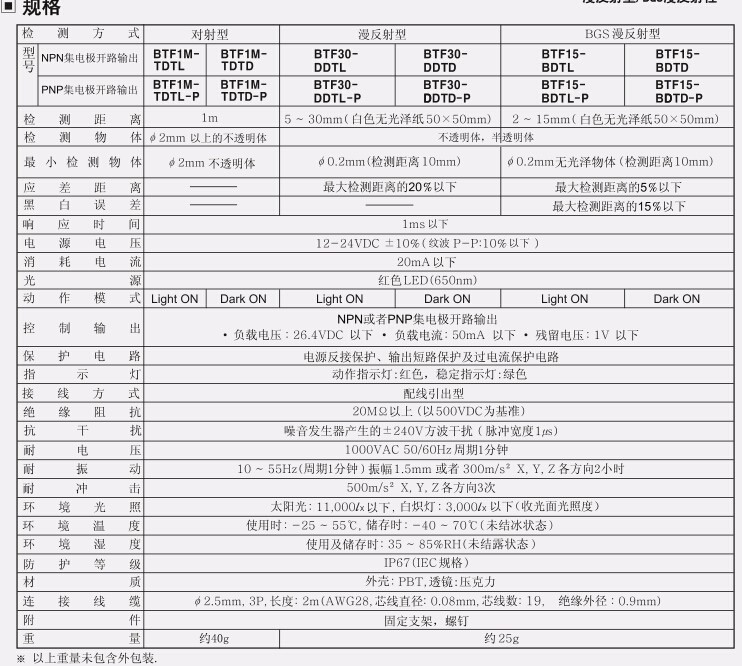 新增遮光动作(Dark ON)模式,增加用户选择空间。采用自主研发的专用IC,3.7mm超薄设计,适合在狭小的空间使用,采用红色LED可视光源易于确认光斑位置。此外,所采用的BGS检测方式将背景物体的影响降至最低(BGS反射型),最小可检测Ø0.2mm无光泽的微小物体,防护等级为IP67,实现高性能检测。