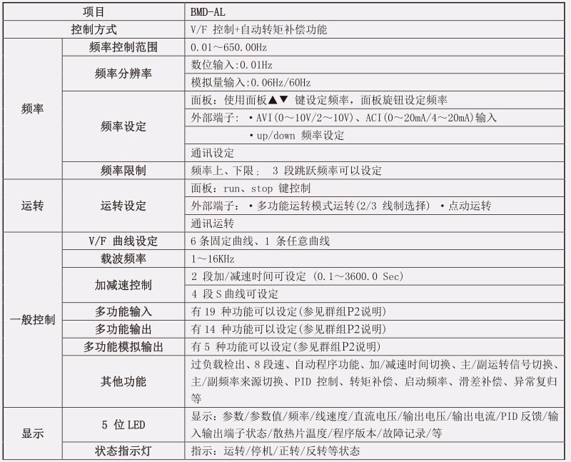 * 0-650Hz(1000Hz可选)输出,8段速,内置PID控制