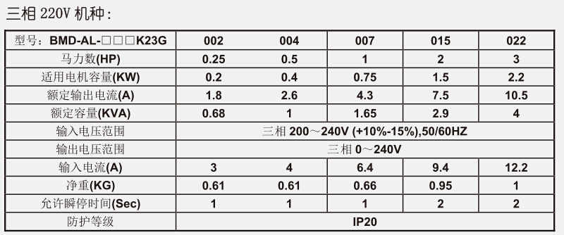 | BMD-AL-022K23G 单相220V,2.2KW |