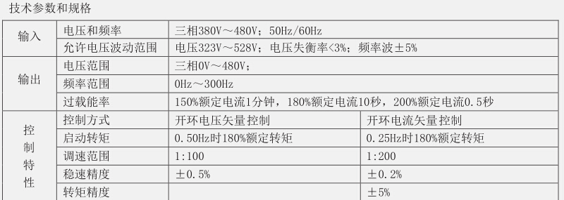 * 稳速精度:±5%(开环电压矢量控制),±2%(开环电流矢量控制)