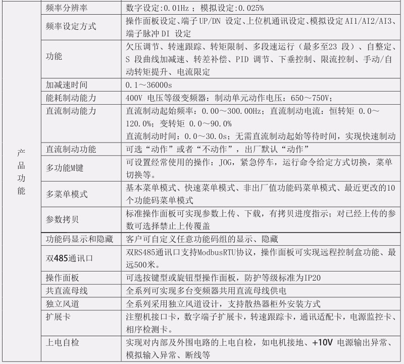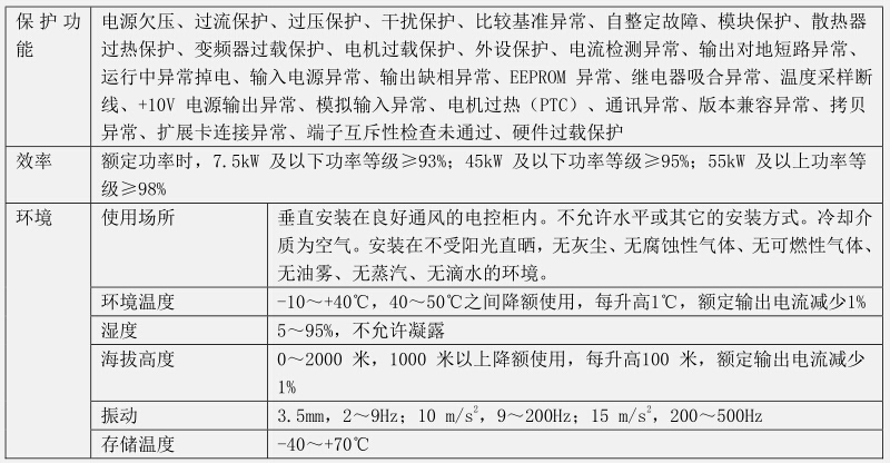 * 调速范围:1:100(开环电压矢量控制),1:200(开环电流矢量控制)