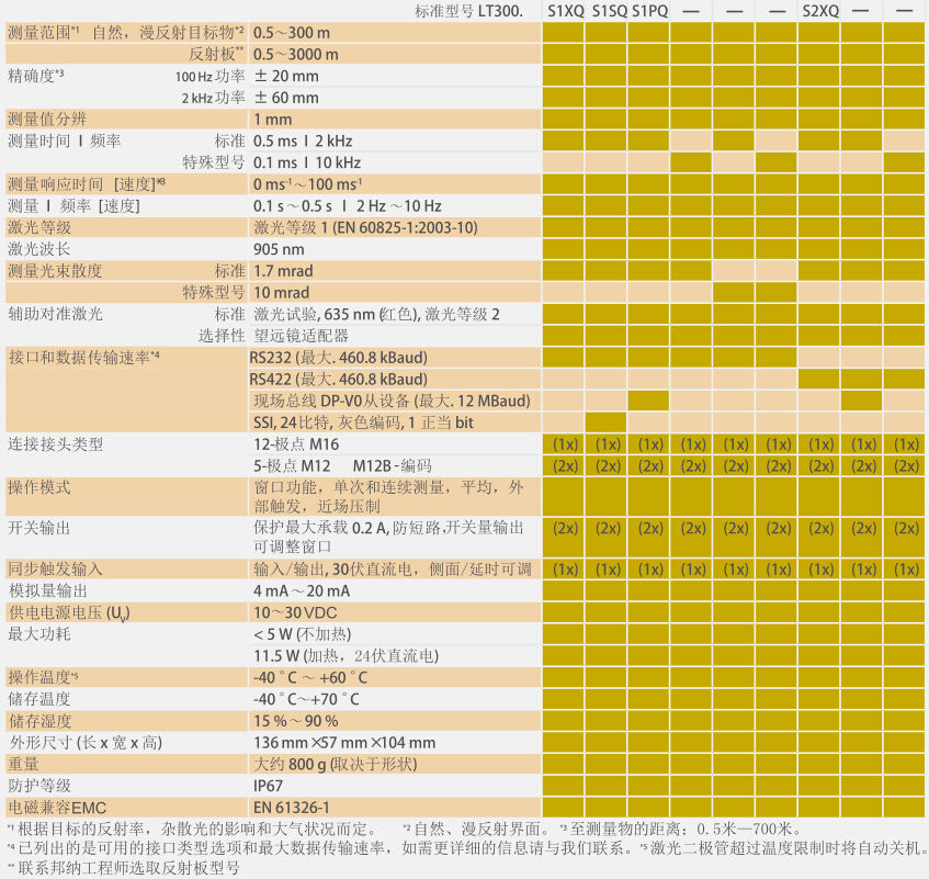 LT300系列激光测距仪的"Time of flight"测量原理特别适用于测量远距离,配置了如RS232串口,RS422,SSI和Profibus等接口,并可提供加热,状态显示和瞄准等设备,可在各种恶劣工业环境下应用.