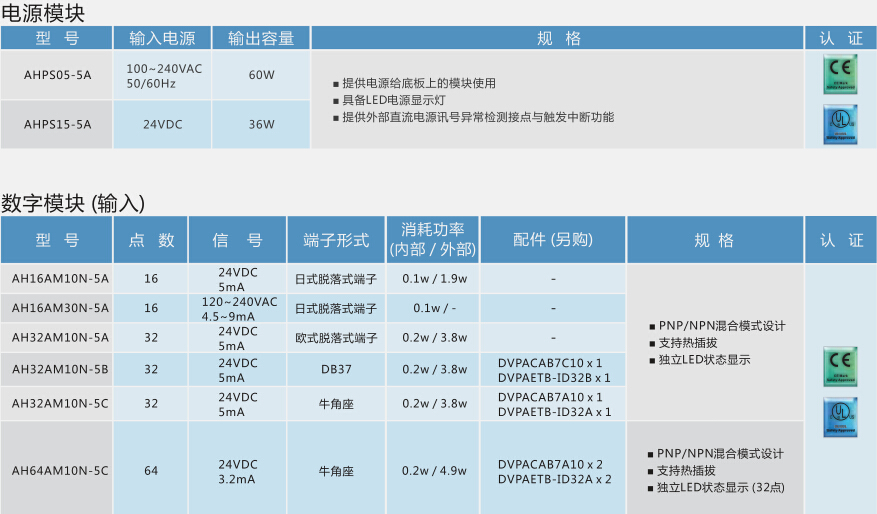 | AH32AM10N-5B | 24Vdc, 5 mA, 32 DI直流NPN/PNP输入 |