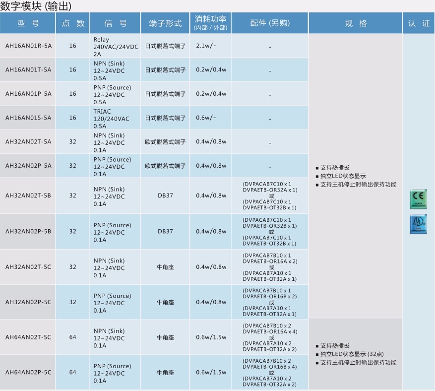 | AH32AN02P-5B | 12 to 24 Vdc, 32 DO直流PNP输出,每个DO输出电流为0.1A |