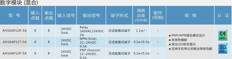 | AH16AP11R-5A | 24Vdc, 5 mA, 8 DI直流输入, 240Vac/24Vdc, 2A, 8DO继电器输出,混合模块 |