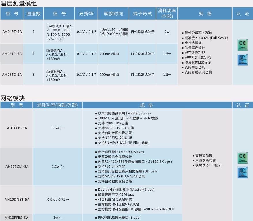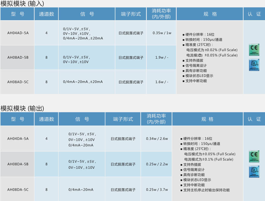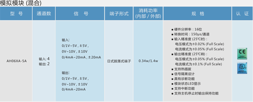 | AH500系列模拟量模块,16bits,转换时间:每个通道150us | |