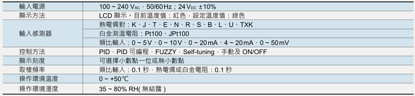 * 可接多种热电偶 (B、E、J、K、L、N、R、S、T、U、TXK) 及白金电阻 (PT100、JPT100) 经由参数自行设定